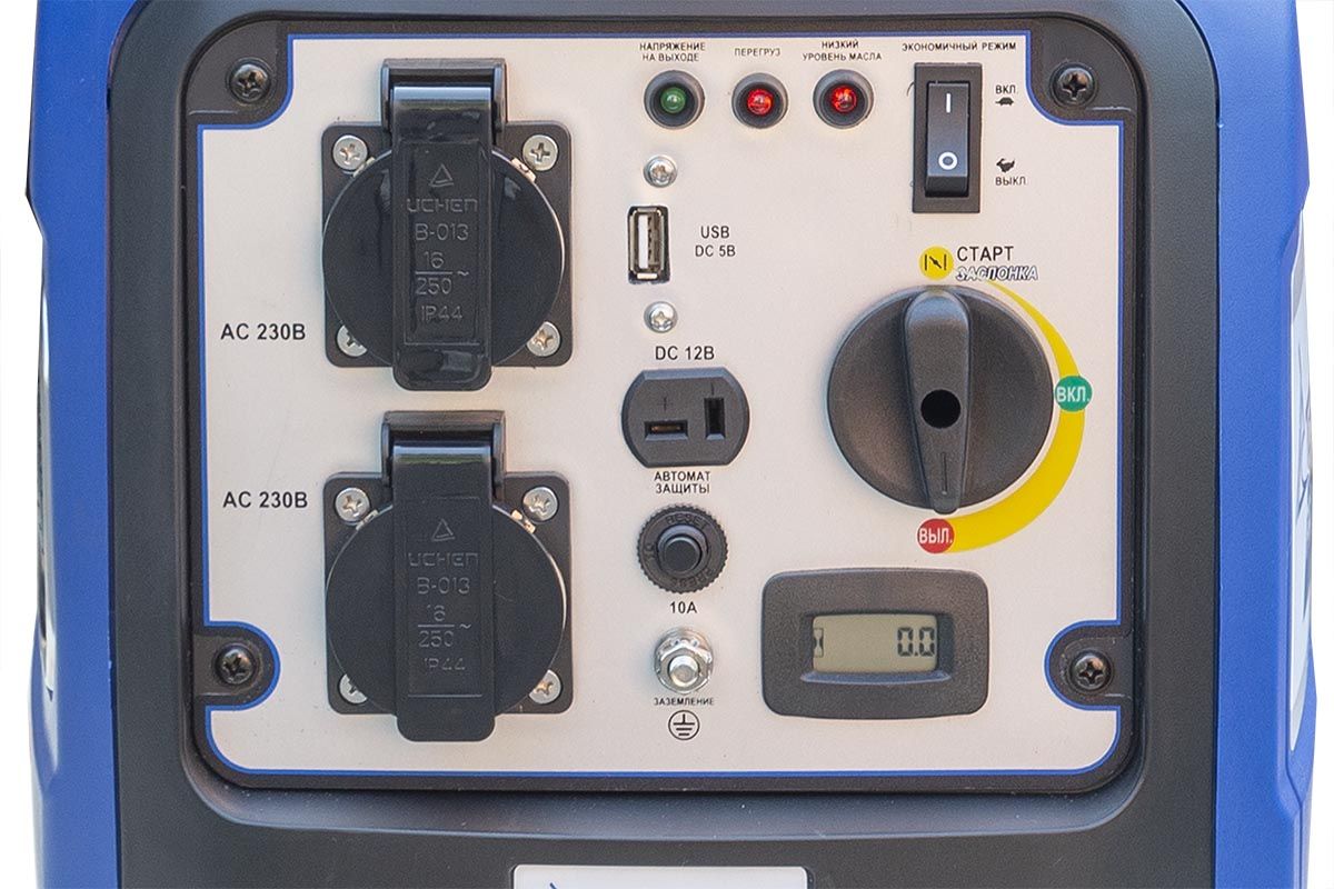 - Индикаторы на панели паказывают параметры напряжения, превышение мощности генератора, низкий уровень масла;